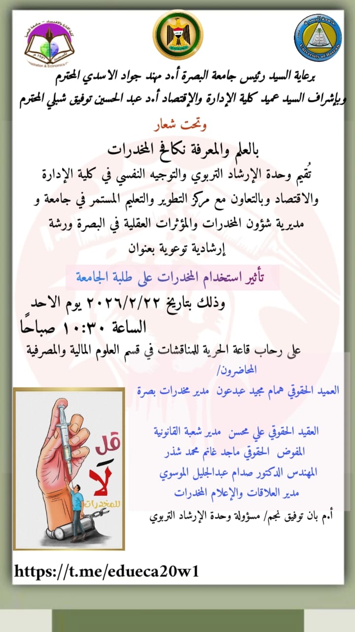 تقيم وحدة الارشاد التربوي والتوجيه النفسي في كلية الإدارة والاقتصاد وبالتعاون مع مركز التطوير والتعليم المستمر في جامعة و مديرية شؤون المخدرات والمؤثرات العقلية في البصرة ورشة ارشادية توعوية بعنوان